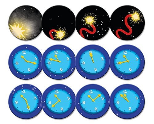 Oh but you aren’t allowed to see what cards you are holding. You hold them facing away from you. This isn’t just a set collection game it’s a co-operative set collection game. The other players can see what you’ve got and its up to them to help you figure it out. As well as the cards there are a selection of tokens, a blue countdown pile, which when its empty the show starts and you score the cards you’ve got out, and 4 fuse tokens, which when they are all in the middle of the table the show is a catastrophic failure and the game ends in a loss!